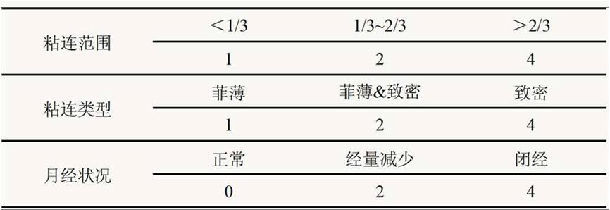 宫腔粘连的诊断,目前借助于经阴道妇科超声、子宫输卵管造影及宫腔镜检查,其中宫腔镜检查为诊断宫腔粘连的金标准,同时部分时候也是治疗宫腔粘连的一种有效的途径;宫腔粘连的分度目前仍采用1988年美国生育协会标准,主要依据粘连的范围、粘连类型及月经状况,其中评分0-4分为I型(轻度)、5-8分为II型(5中度)、9-12分为III型(重度);具体如下: