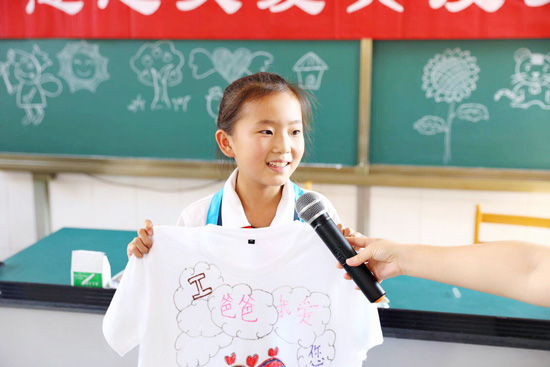 五颜六色的颜料,一字排开的画笔,活动开始后小朋友开动脑筋,在白色T恤衫上画上了各种图案。有的画了自己和爸爸手牵着手散步,有的画上了一颗爱心表达对爸爸的爱,还有的画了爸爸背着小小的自己……经过小朋友们的一番创意改造,原本平常的白T恤让人眼前一亮。“常说女儿是父亲的贴心小棉袄,我要把自己画的小T恤送给爸爸,夏天爸爸就可以穿我画的新衣服了。”小朋友开心地说道。