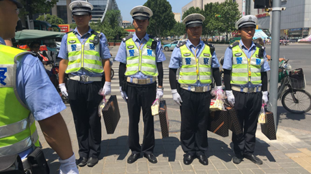 随后,慰问组又来到市中区交警大队大观园中队,炎炎烈日、高温酷暑,一线交警和文明交通志愿者始终坚守岗位,为群众出行创造安全、畅通、有序的道路交通环境。济南红绘医院志愿者为坚守岗位的一线交警同志送上夏季消暑用品,并对他们战高温、无私奉献、创造和谐有序的交通环境表示衷心的感谢以及崇高的敬意!