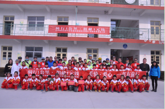 爱骑超级俱乐部队员与宋庄小学孩子们合影留念